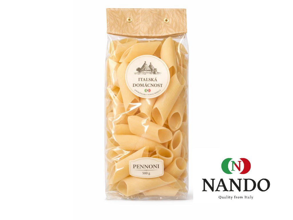 Těstoviny PENNONI - oblíbený tvar těstovin. Velké "trubky" se hodí například k zapékání v troubě. Ve stavu před uvařením mají délku 10 cm.